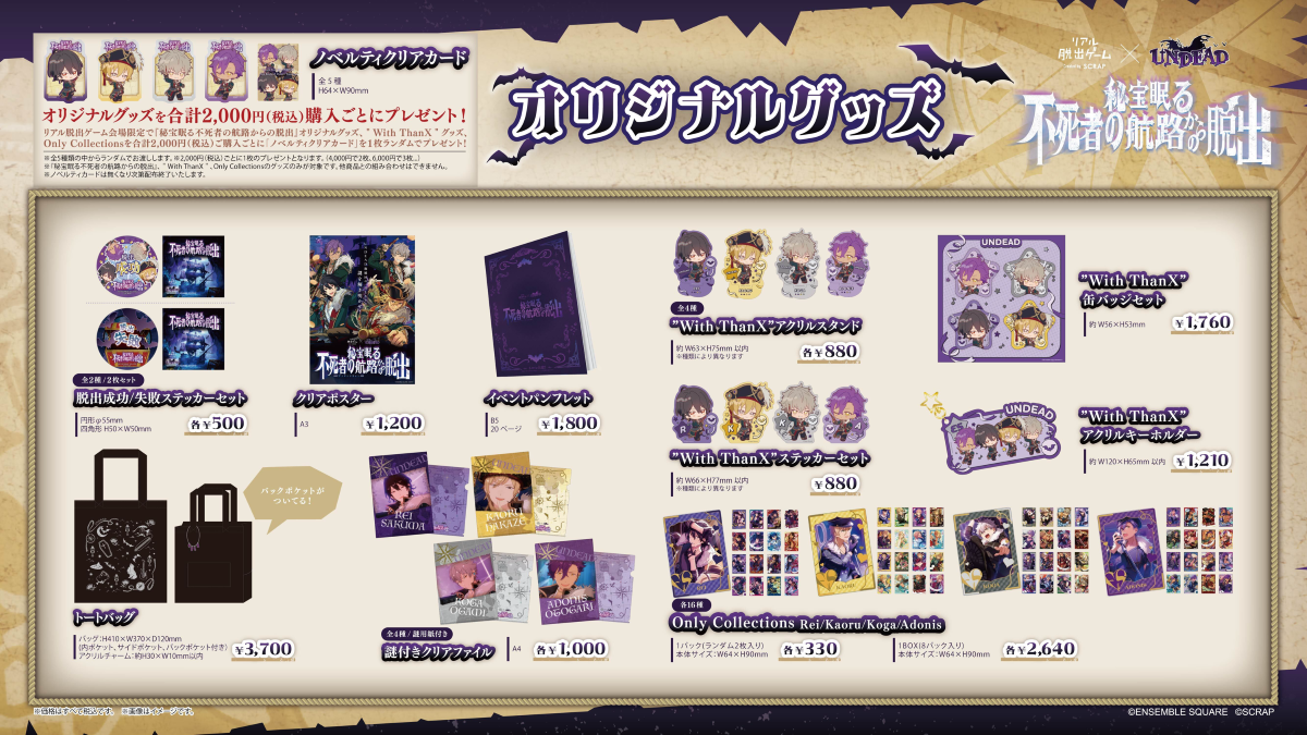 通常のチケットに加え、前売チケット購入時のみ購入可能な限定グッズ「『UNDEAD』PIRATES SET」が付属する「特典付きチケット」を販売いたします。この限定グッズは、『UNDEAD』海賊団をイメージしたバンダナとビジュアルカード、そしてカードホルダーがセットになっており、『UNDEAD』ファン必見のアイテムです。