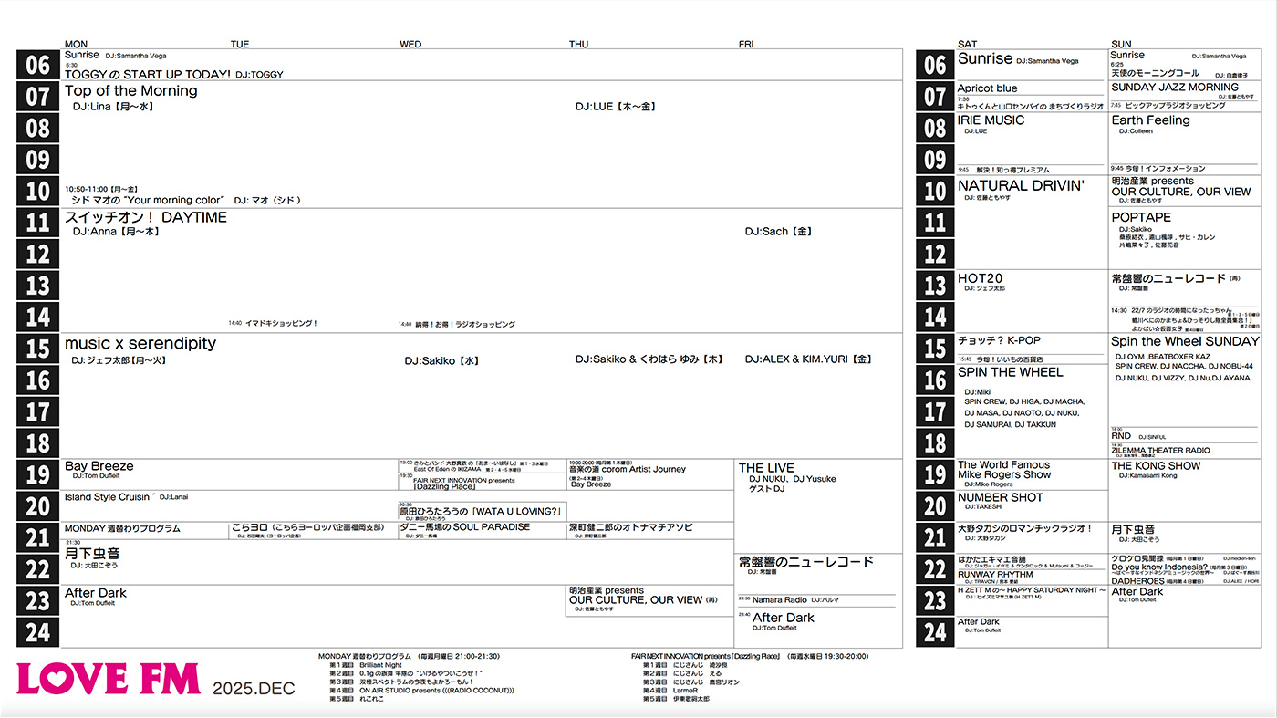 仕事や勉強、家事など、それぞれの場所で頑張るあなたへお届けするプログラム。お昼のひとときを、もっと充実させるための情報と音楽をあなたに。国内外の最新ニュースから、知的好奇心をくすぐるトレンドまで、日々の生活が少し豊かになるようなトピックが満載。そして、あなたの頑張りを後押しする「音楽」を厳選してお届け。好奇心旺盛なAnnaとSachが、趣味から仕事、最新トレンドまで、ジャンルを飛び越えて素敵な情報をお送りします!