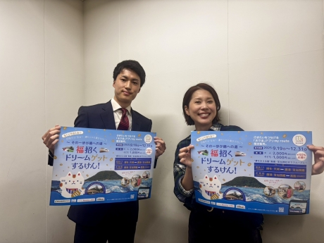 今日は佐賀県交通政策課地域交通システム室から山﨑健司さんにご出演いただき、すでに販売が開始している宝くじの当選祈願で有名な唐津市高島への移動に便利でお得な交通チケット「福招くドリームゲットするけん!」についてご紹介いただきました!