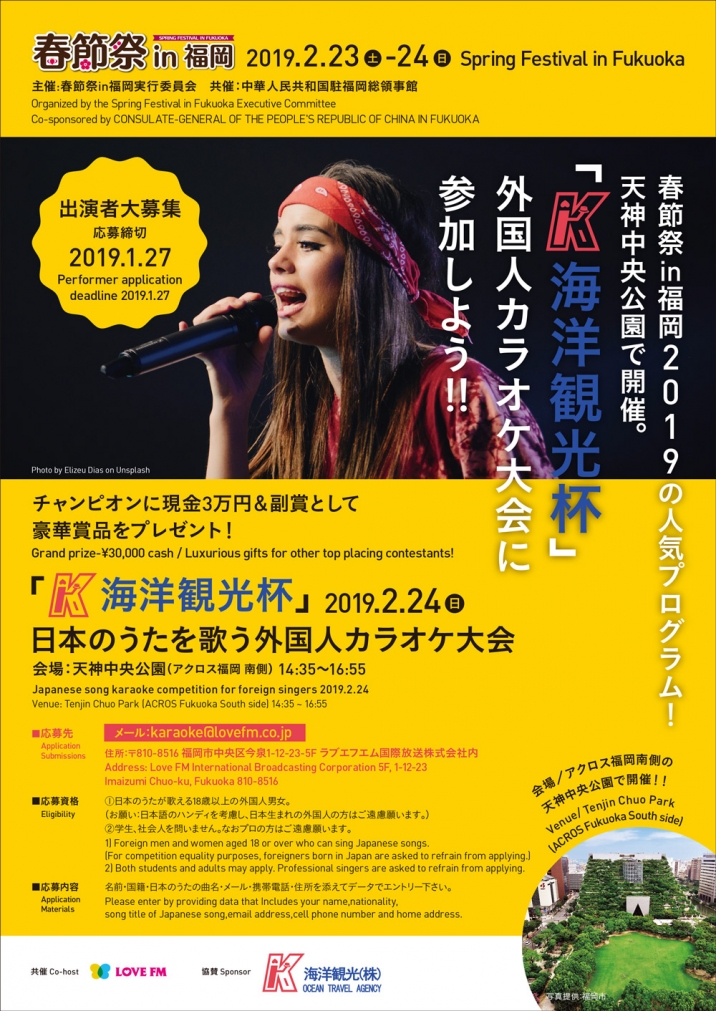 連絡先:LOVE FM 海洋観光杯春節祭in福岡2019「日本のうたを歌う外国人カラオケ大会」公募係